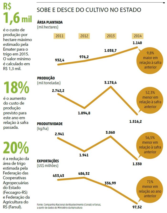 Em 2014, a produção de trigo teve queda superior a 50% no Estado e boa parte do que sobrou sequer teve qualidade para moagem. De 1,5 milhão de tonelada colhida em 2014, quase 1 milhão teve de ser exportada para países africanos e asiáticos. Com nível de micotoxina acima do permitido pela lei, o cereal não pôde ser destinado nem para ração animal no mercado interno.