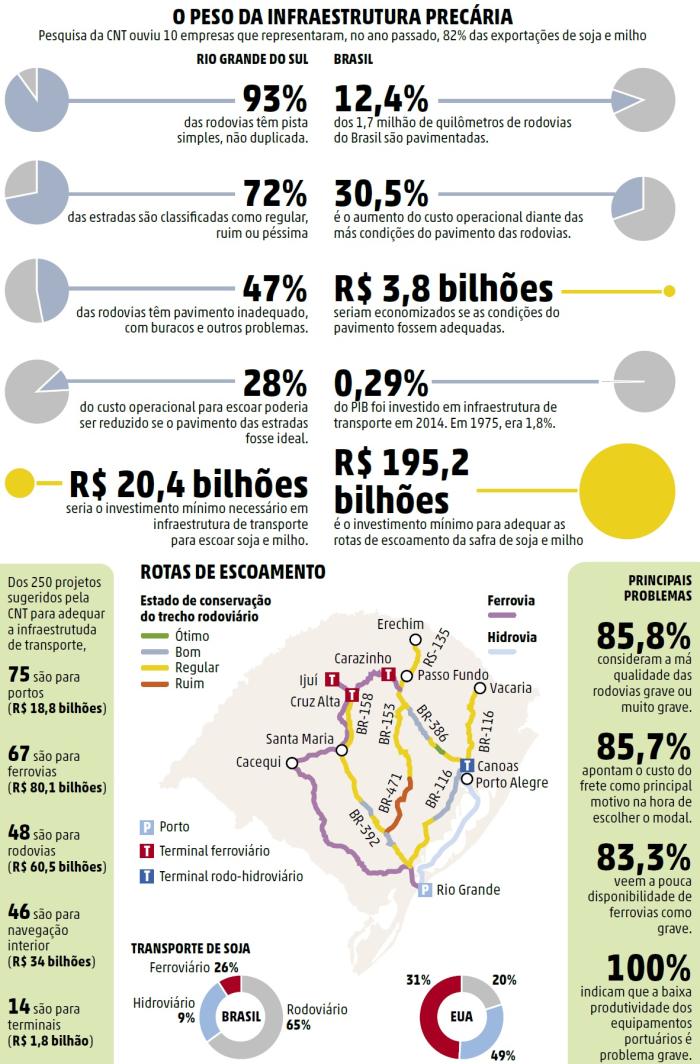 Sobre o Rio Grande do Sul, Priscila ressalta que 72% das estradas foram consideradas inadequadas, o que faz encarecer em 28% o custo operacional no Estado. A pesquisa indicou que seria necessário investir R$ 20,4 bilhões para adequar o escoamento de soja e milho no RS - 45% em estradas e o restante em ações como a ferrovia Norte-Sul e a qualificação do porto de Rio Grande, de onde saem 99% das exportações: