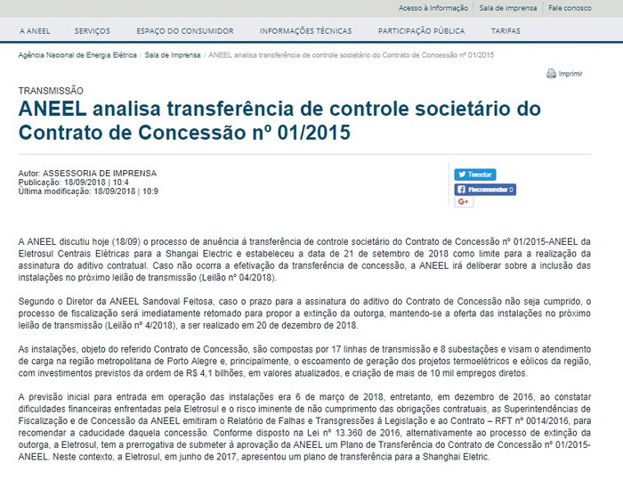 Menos de um mês depois da solenidade no Palácio Piratini que marcou o acordo entre Eletrosul, subsidiária da Eletrobras, e a chinesa Shanghai Electric, a Agência Nacional de Energia Elétrica (Aneel) deu uma espécie de ultimato às empresas. Determinou nesta terça-feria que as empresas devem finalizar em três dias o aditivo ao contrato de parceria para executar as obras que representam investimentos em transmissão de energia elétrica ao redor de R$ 3,9 bilhões.