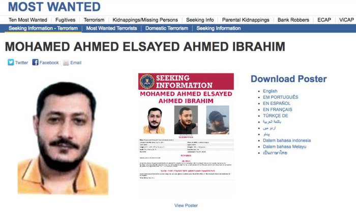 Mohamed Ahmed Elsayed Ahmed Ibrahim, 42 anos, ingressou no Brasil em 2018 e obteve autorização de residência. Ele está em condição migratória regular. Um anúncio feito pelo FBI e divulgado pelo Ministério da Justiça diz que o suspeito deve ser considerado "armado e perigoso".