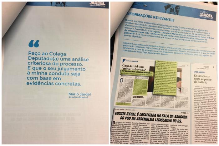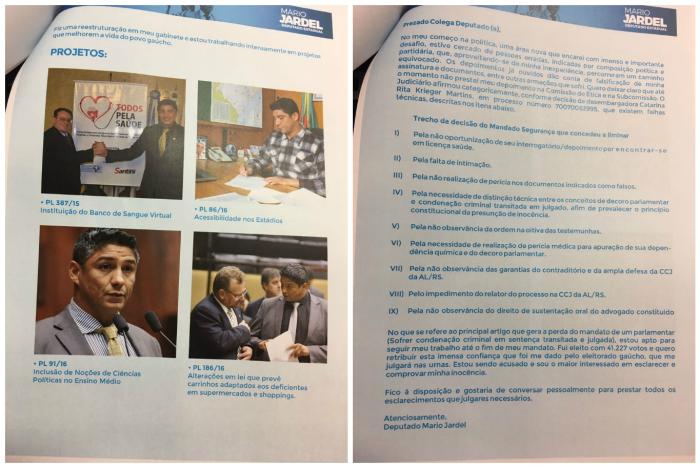 A assessoria do deputado Mario Jardel (PSD) está distribuindo nos gabinetes parlamentares da Assembleia Legislativa um documento com cinco páginas pedindo "análise criteriosa" do processo que pede a cassação do ex-atleta. Reunindo notícias publicadas em diversos veículos de comunicação, o deputado dá a entender que foi vítima de uma armação.