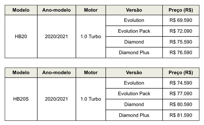 A família HB20 2021 está completa. A renovação anual da gama de compactos Hyundai foi concluída com a chegada das versões com o motor 1.0 turbo. Todas as opções têm nova grade e, a partir da Evolution Parck, novos recursos eletrônicos. Na versão Evolution, o HB20 2021 tem preço a partir de R$ 69.590, e o HB20 S 2021, de R$ 74.590.