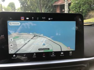 A central multimídia de 10,1 polegadas interativa é sensível ao toque e funciona por comando por voz ou pelo volante. O sistema é compatível com Android Auto, Apple CarPlay e aplicativos sem fio. Além disso, traz navegação por GPS integrada como os modelos topo de linha da Fiat e Jeep e o carregamento do celular por indução, que usamos diversas vezes.