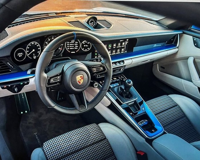 O interior valoriza o revestimento em couro e tecido premium em padrão claro, preto e azul. A assinatura Sally Carrera estará em diversos pontos, como no painel e laterais das portas, entre outros.