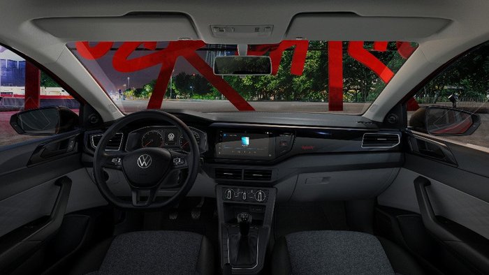 O painel com emblema e acabamento em preto brilhante e o multimídia VW Play com tela digital de 10 polegadas interativa com Android Auto, Apple CarPlay e aplicativos sem fio no console destacam o interior.