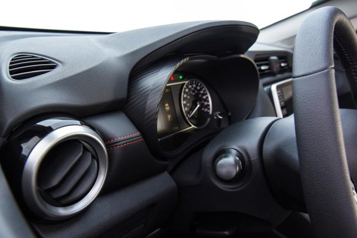 O volante, console central, painel e portas tem detalhes em alumínio e cromados nas maçanetas internas. O quadro de instrumentos e as portas tem acabamento com aparência de fibra de carbono.