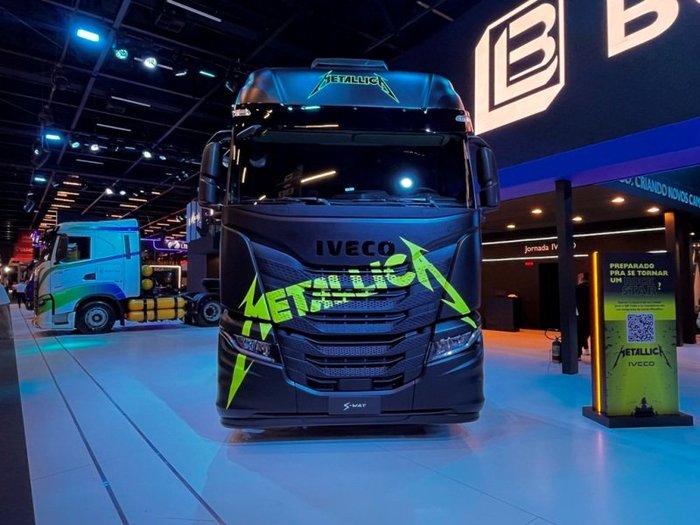 O heavy metaI S-Way Metallica brilhou no espaço da Iveco. Desenvolvido pela matriz italiana com parceria com a famosa banda de rock, grafismos identificam a configuração. O S-Way Metallica terá 24 unidades disponíveis no país com tração 6x4 e motores de 480 cv e 540 cv.