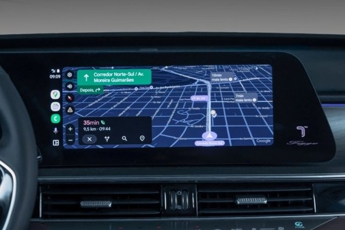 Volante multifuncional, a generosa tela digital full HD de 24,6” do quadro de instrumentos e do multimidia destacam o interior com acabamento escurecido premium. Interativa com Android Auto, Apple CarPlay e aplicativos sem fio, mostra imagem da câmera 360º e atua também por comando de voz. A iluminação interna é por LED.