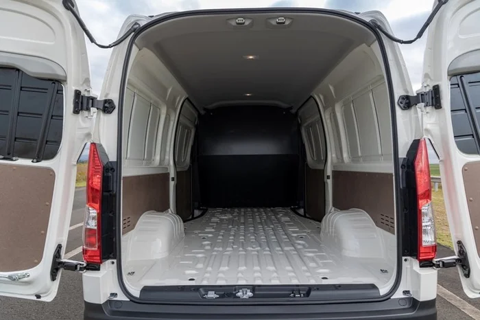 Design funcional, o espaço interno, o comportamento e a praticidade qualificam a Hiace. O compartimento de carga possui acesso pelas portas laterais deslizantes traseiras, o que facilita a carga e descarga em ambientes urbanos.
