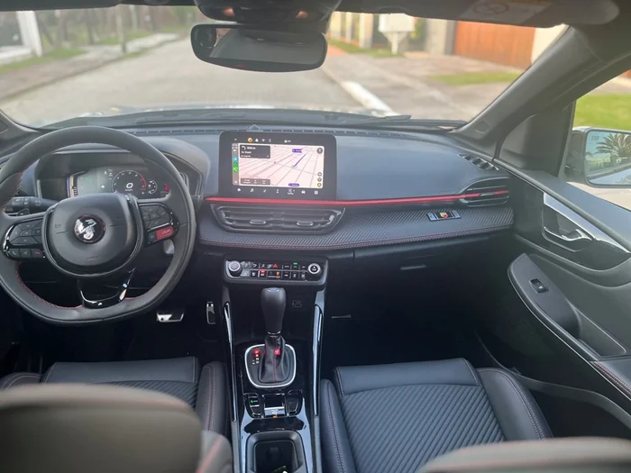 A base achatada do volante, as costuras vermelhas nos bancos, as telas digitais dos instrumentos e multimídia, o logo do escorpião e os detalhes vermelhos personalizam o interior premium escurecido.
