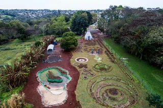 Foi o que bastou para Neimar esboçar um croqui e, com a ajuda dos funcionários que residem no campus, sair revirando a terra. Com um compasso de cordas nas mãos, ele desenhou as mandalas e crop circules, aquelas formações redondas que surgem nas lavouras parecendo intervenção alienígena. Cada geometria começou a ganhar vida com o cultivo de 3 mil mudas orgânicas de alface, repolho, tomate, pepino, chuchu, agrião, coentro e tantas outros legumes e hortaliças. Um espelho d'água surgiu para abrigar um viveiro de peixes, ao lado nasceu um banco circular cavado no chão concebido para abrigar uma fogueira no centro, onde repousa uma estrela de David. Na ponta do terreno, foi construído um lago artificial com 120 mil litros de água. Com o passar dos meses, o que seria uma horta pensada para fornecer comida saudável durante o confinamento começou a ganhar contornos de enorme laboratório de agroecologia.