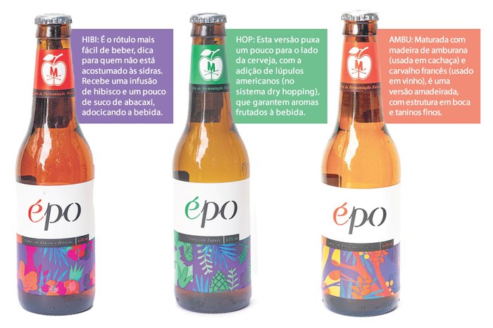 A Épo – cujo nome mistura a pronúncia de apple (maçã, em inglês) e a expressão brasileira “É, pô!” – é preparada em parceria com a vinícola Cia. Piagentini, de Caxias do Sul, com maçãs Gala e Fuji de Vacaria e da serra catarinense. São três rótulos diferentes feitos com a mesma base da fruta fermentada.