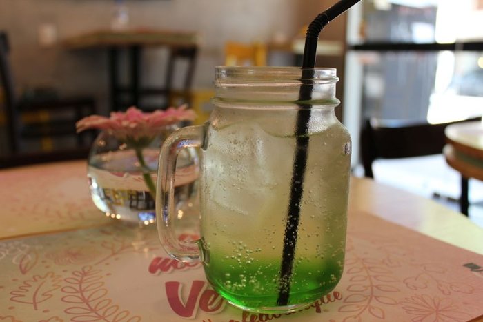 35 graus na rua. Cheguei bufando e fui direto pedindo algo para refrescar. Uma soda italiana. Notei que a soda italiana invadiu os cardápios. Eu confesso que estranhei no início, mas agora estou curtindo. A soda é uma mistura de água com gás, gelo e uma fruta ou uma calda. Essa é com essência de maçã verde.