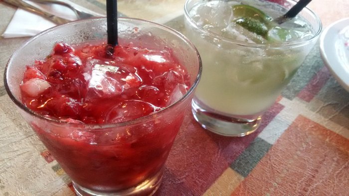 Nosso primeiro pedido foram duas caipirinhas, de morango e de limão, coloridas e docinhas.