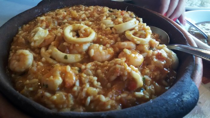 Mas a grande alegria foi quando vieram os pratos principais. Risoto de frutos do mar, feito realmente com arroz arbóreo e muita lula e camarão (pedimos para tirar o berbigão, mas o molusco também faz parte do prato) cozidos no ponto exato. É um prato relativamente difícil de fazer, porque cada elemento tem um ponto diferente de cozimento.