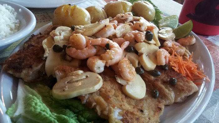 Pedimos também um congrio grill, grelhado com camarões, champignon e as famigeradas alcaparras. Tradicional, nada fora do comum no quesito criatividade, mas também muito bem preparado
