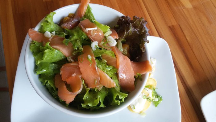 Uma rápida analisada no cardápio e logo decidimos o que pedir. Decidimos escolher a salada Noruega como uma espécie de entrada, mas acabamos nos esquecendo de avisar para esse prato vir antes e tudo chegou ao mesmo tempo na nossa mesa. Em todo caso, a salada estava deliciosa: salmão gravlax, mango chutney, blini de milho e folhas com molho de iogurte.