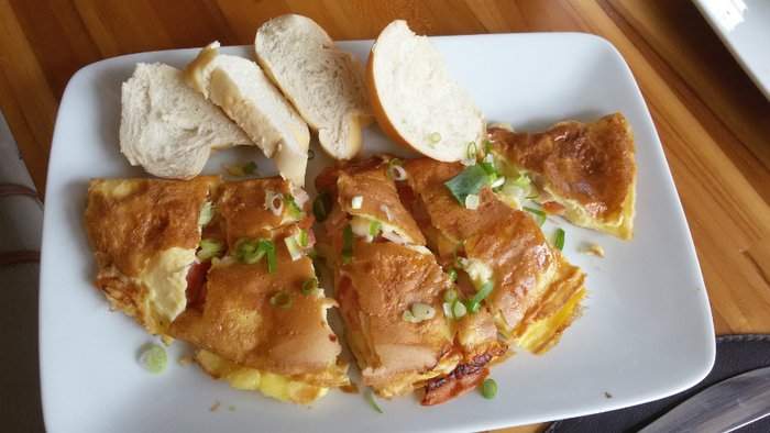 Incrementando um pouco mais, escolhemos o ometele de peito de peru, queijo e tomate. Simples, porém bem feitinho e saboroso. A consistência estava macia e leve. Acompanha fatias de pão.