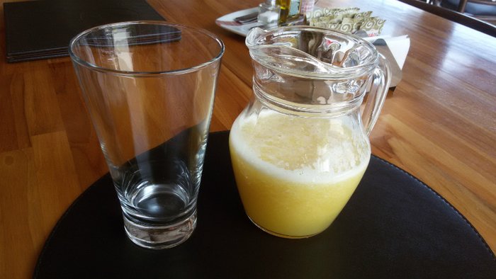A bebida escolhida foi um naturalíssimo suco de laranja, servido sem coar.
