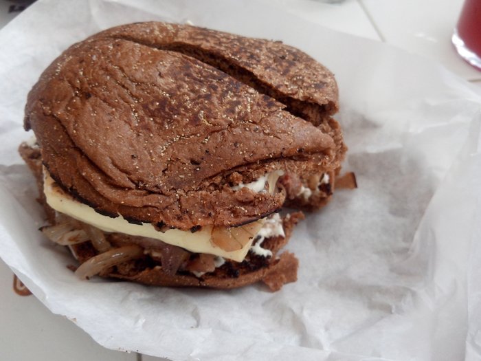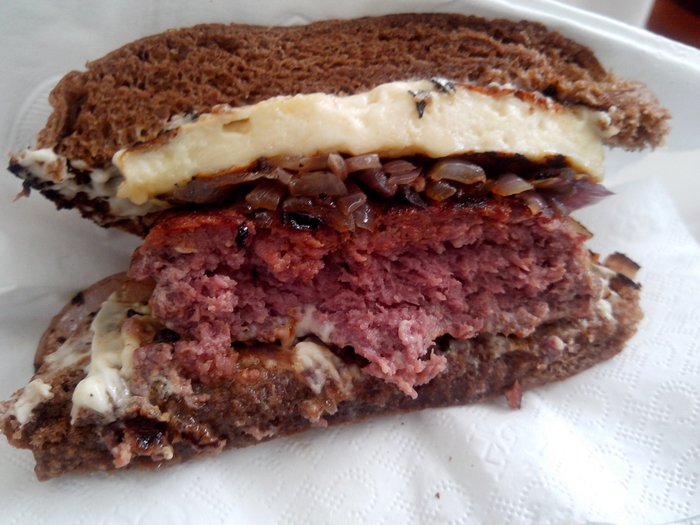 Pausa no corte lateral para reparar as camadas: queijo coalho, cebola caramelizada e o hambúrguer, feito de fraldinha e calabresa, o que dá essa cor avermelhada. O pão australiano fecha bem o conjunto.