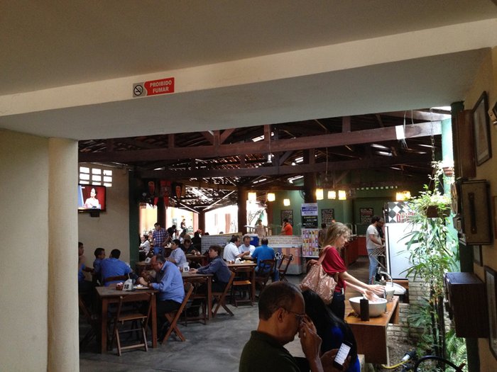 Quando você chega, acha que o local é pequeno, mas ele é bem amplo e tem uma decoração bem legal.