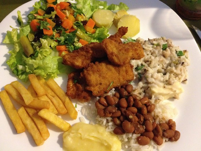 A comida disponível para quem decide pelo PF é a mesma que tem na refeição no peso, porém, em quantidades reduzidas. Ah, e metade das opções, claro. Mas ainda assim, achei bem justo e saboroso. Mas tem que chegar cedo! Acreditem, já fiz o teste. Se você chega às 13h, já não vai pegar tanta variedade.