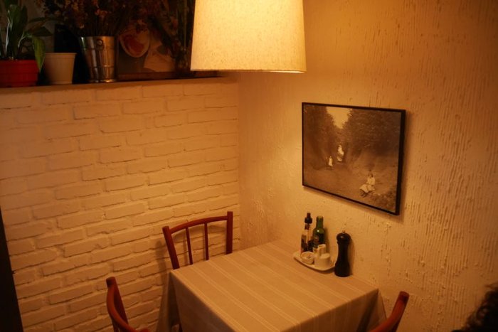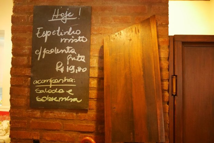 Eu e a Lela chegamos e descolamos a última mesa livre do almoço, bem no cantinho da porta. Todas as mesas são relativamente próximas e o atendimento é bem informal.