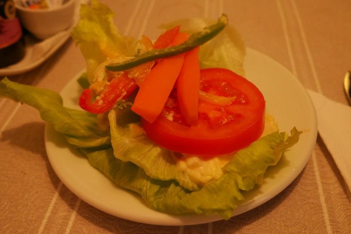 Logo recebemos a salada de entrada com alface, maionese de frango, pimentões, cenoura e tomate. Bem boa e já deu aquela acalmada na fome.