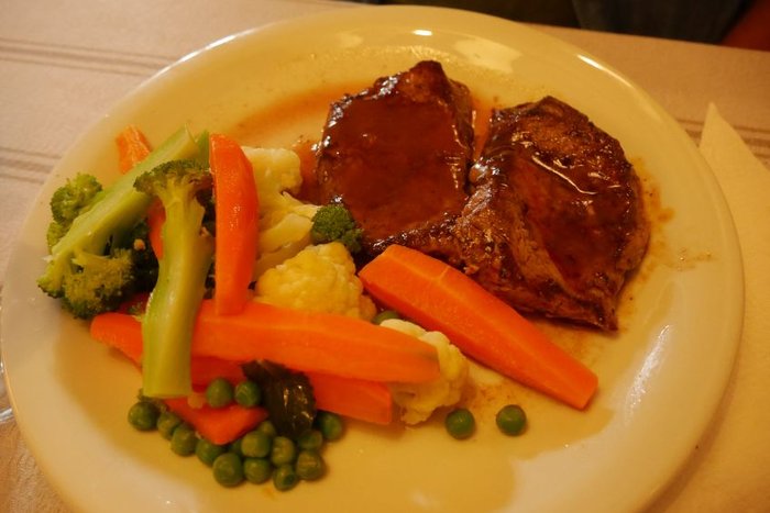 Nada de cardápio, a pessoa que nos atendeu ditou as opções e fomos montando o prato. A Lela foi de filé e legumes cozidos.