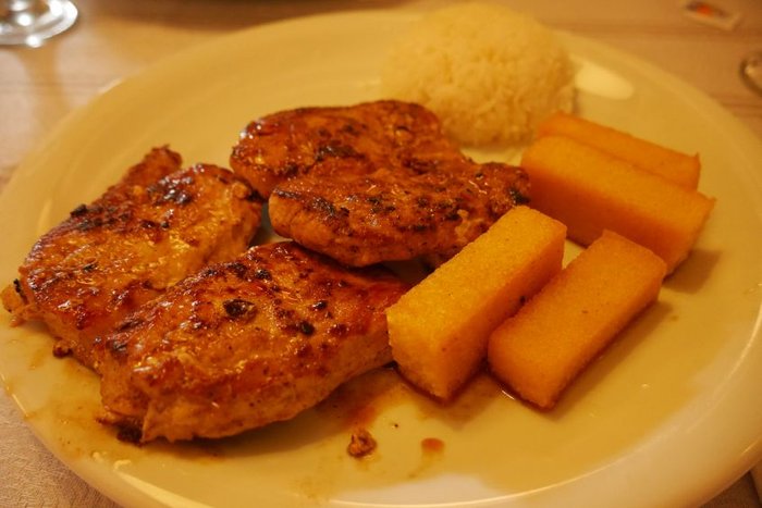 Eu não tive dúvidas de me atirar no lombinho de porco com polenta frita. E ainda vinha um arroz e uma cumbuca com aquele feijãozinho caseiro. Além de estar tudo muito bem feito, o prato tinha uma porção pra lá de bem servida.