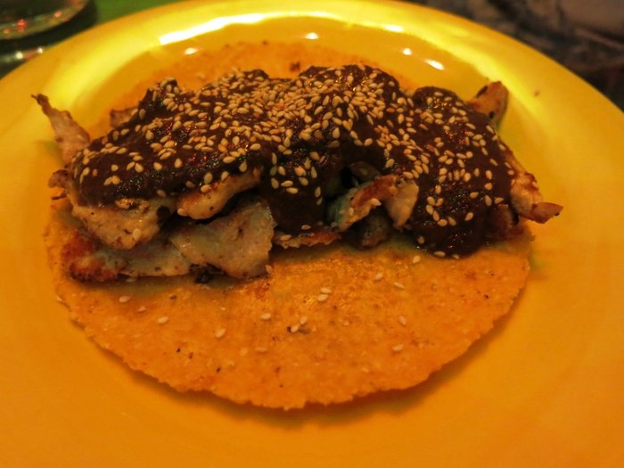 Taco Pollo com mole negro, que consiste em tiras de peito de frango com um tradicional molho mexicano feito de cacau e especiarias.