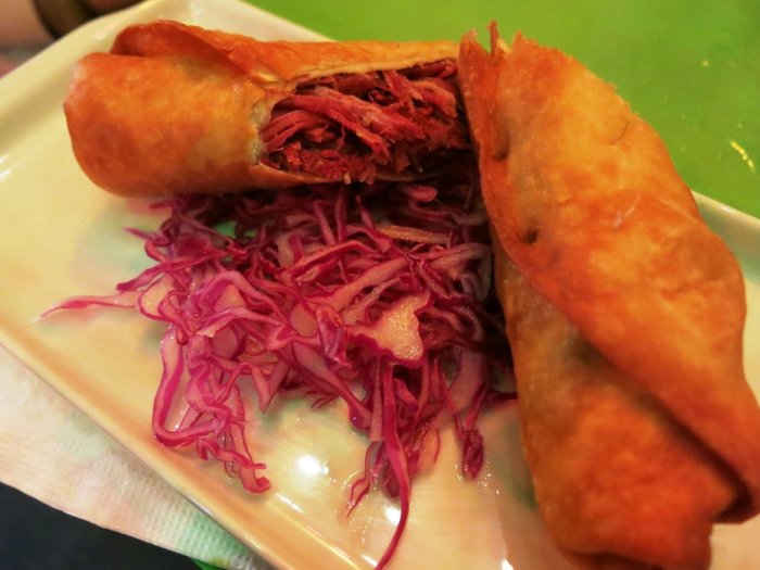 Flauta de carne seca e cebola roxa.