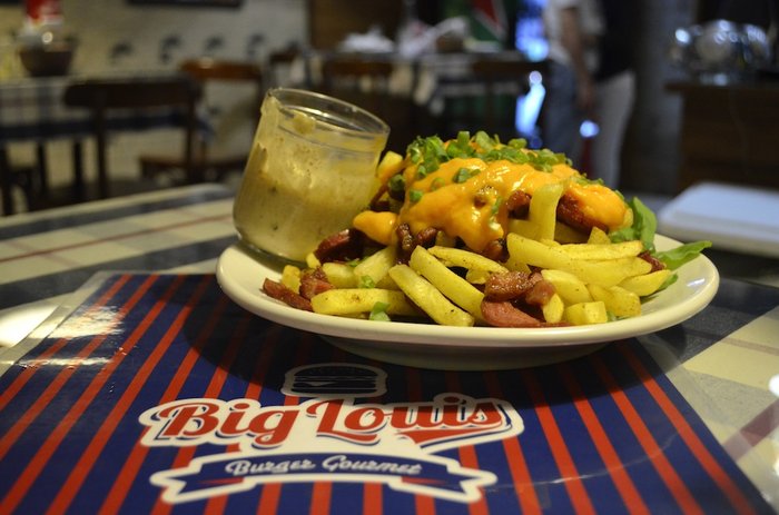 Enquanto cada um escolhia seu hambúrguer, pedimos uma porção de batatas fritas. Essa é a Batata Frita Big Loius: com salsa, cheddar, calabresa, bacon e tempero picante. Um trem de carga cheio de sabor! Me abraça que eu vou chorar!!!