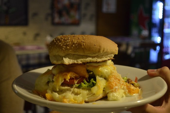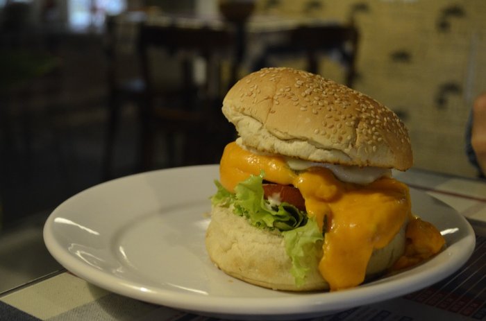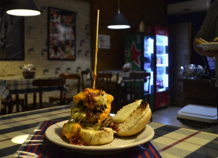 O Pedro foi de Extra Cheese Burger. Tem que curtir queijos! Pão, hambúrguer, Alface, tomate, queijo, molho, cheddar, catupiry, provolone, parmesão e salsa.