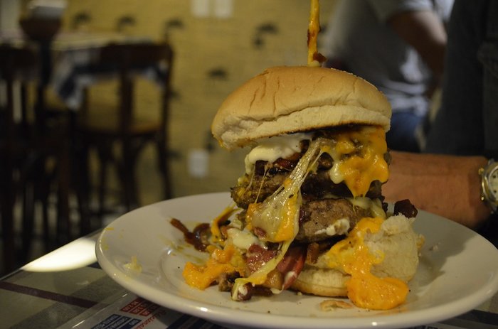 Falando em difícil para morder, há sempre uma surpresa guardada. O cunhado surpreendeu e se jogou de cabeça no Monster Louis Gourmet. Entenda o por quê do monster: pão, 3 hambúrgueres (eu disse 3), queijo, molho, bacon, cheddar, calabresa, cebola caramelizada e salsa.