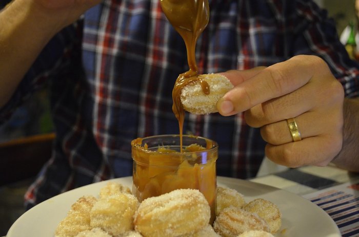 Estômagos quase no limite (o do cunhado Mauro certamente estava, depois do Monster). Mas, como eu disse...quase! Vamos à sobremesa. Nada mais nada menos do que uma pequena porção de 18 mini churros quentinhos, recheados e com doce de leite extra!