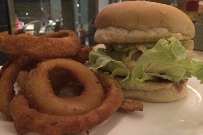 O Hambúrguer de Picanha foi a escolha da Cássia: 180g de hambúrguer de picanha, cebola crocante, queijo prato, alface e maionese da casa. Onion rings acompanhou.