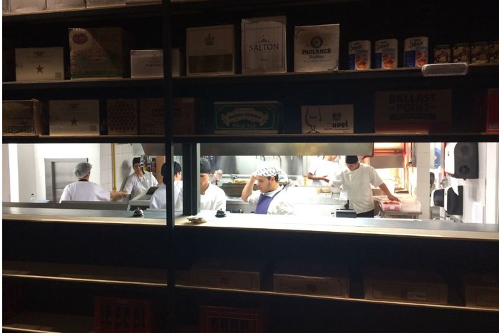 A cozinha também fica embaixo: a gente pode ver a função por um fresta. Neste andar, também ficam algumas mesas.