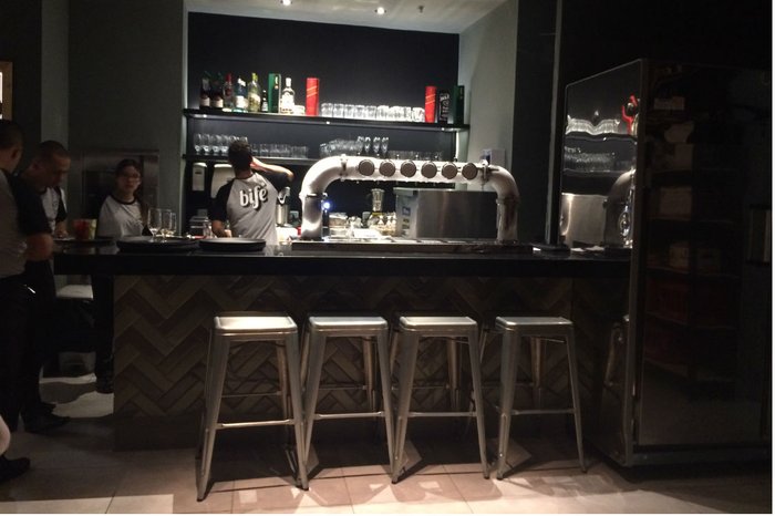 Chegamos cedo, por volta das 20h, e o local estava cheio. Não lotado, mas cheio. São três andares. No primeiro, a entrada chama a atenção já pela decoração que lembra armazém antigo, meio pop meio vintage, com caixas antigas de Coca-Cola e pé direito alto.