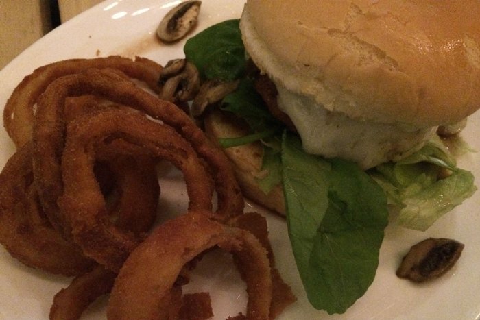 Os cardápios vieram, e a regra era simples: cada um iria pedir um hambúrguer diferente - o Marcelo, a Cássia e o Márcio já estão acostumado a me acompanhar nas saídas para fazer post e sabem como devem se comportar. O Marcelo saiu na frente e pediu o meu preferido: o Hambúrguer Cowboy, com cogumelos no whisky, muçarela de búfala, maionese de raiz forte e mix de folhas. Como acompanhamento, onion rings.