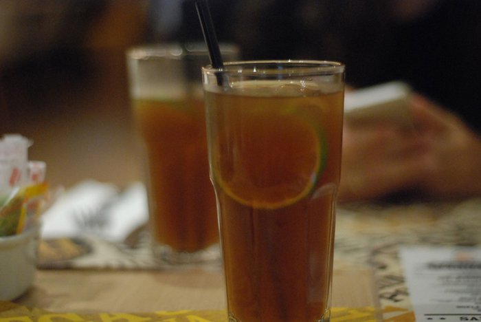 Pedimos um chá da casa para acompanhar. Muda semanalmente. Esse tinha limão, gengibre e chá mate. Bem refrescante.
