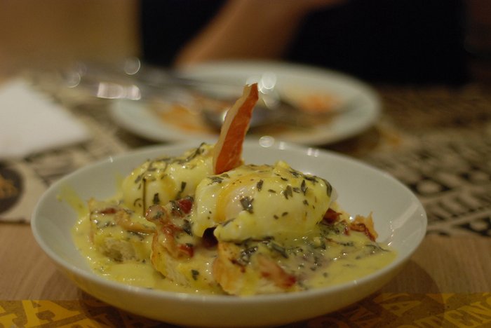 Depois pedimos o lindo e maravilhoso Eggs Beneditinos. Uma fatia de brioche servida com 2 ovos pochet, crocante de presunto parma e molho bernaise da casa. Sensacional! Gema na medida, molho super gostoso.
