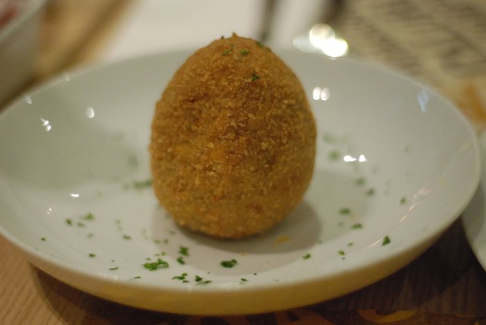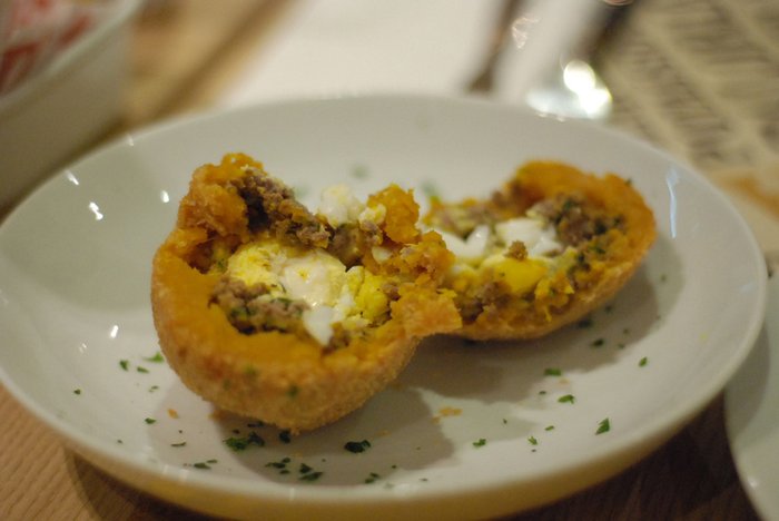 Além da carne moída que cerca o ovo, uma camada de abóbora temperada vem na sequencia. Ficou muito bom! Recomendo ( e é R$8,00 e bem servido!).