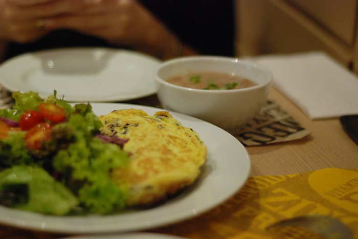 Ainda rolou uma omeletinha, porque amamos omeletes. Pedimos a de cogumelos. Bem gordinha e recheada. Tem direito a dois acompanhamentos. Escolhemos salada e feijão.