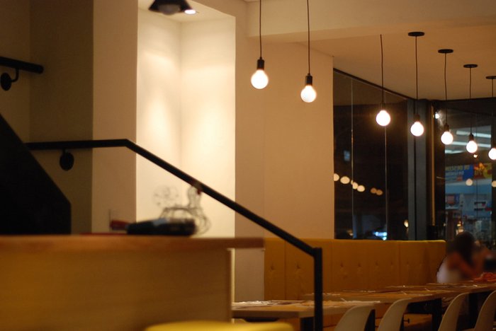 O espaço é de um tamanho ideal. Nem muito grande, nem muito pequeno, cadeiras confortáveis e luz meio baixa. Super agradável. Fomos no final do dia. O atendimento foi ótimo também.
