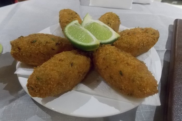 Pedimos também uma porção de bolinhos de bacalhau. Crocantes, bem temperados e cheios de bacalhau, delícia!