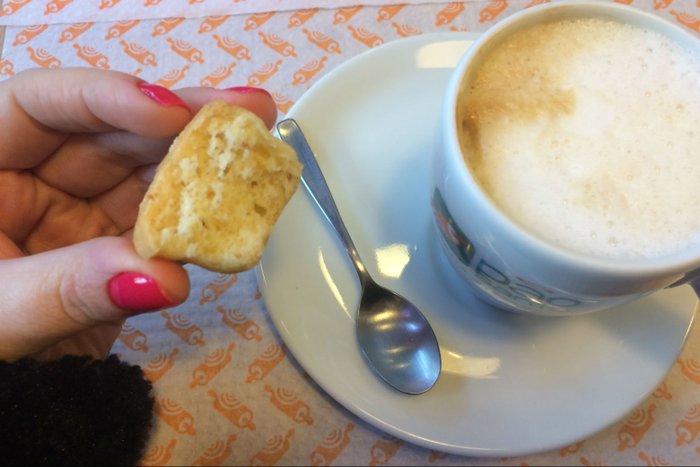 O primeiro pedido foi um cortado, servido com um minibolo inglês.