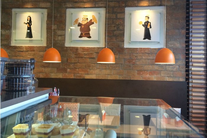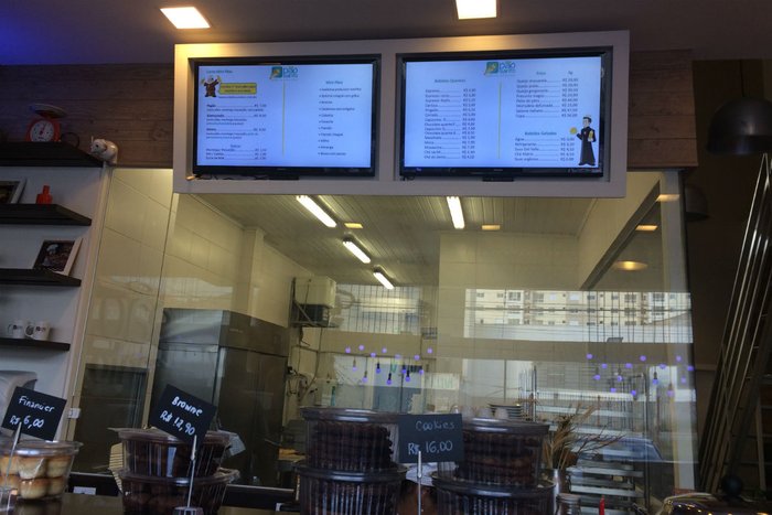 O lugar é pequeno, mas bem bonitinho. O cardápio fica em televisões no alto da bancada de atendimento. É por ali que os clientes escolhem o que desejam.