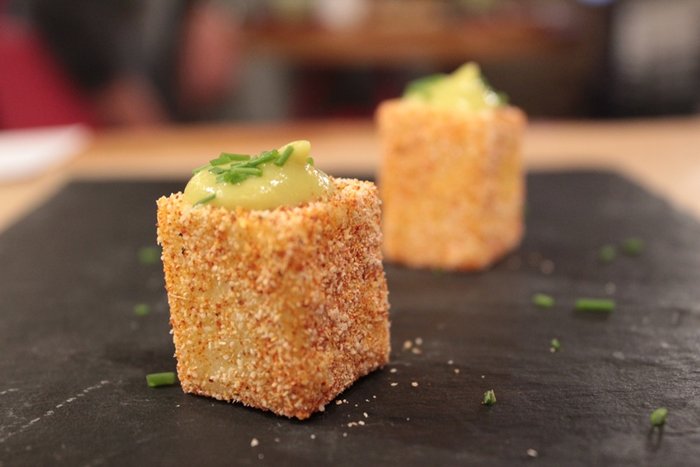 A Tapita chegou logo depois do couvert. Papa brava com maionese de abacate. Um delicioso dadinho de batata crocante por fora, molinha por dentro. Genial! A maionese de abacate estava levinha. Adoramos.