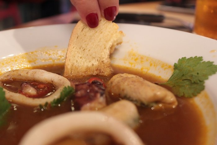 Seguindo o Al Punto, como entrada, uma sopa cubana de frutos do mar. Tinha lula, polvo, mexilhão, batata e batata doce, coentro e chili. Dos deuses! Aprovadíssima. Cheia de texturas e sabores.